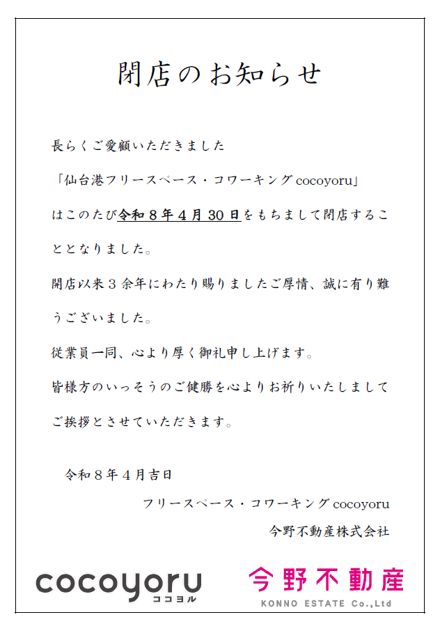 平素より「フリースペース・コワーキングcocoyoru」をご利用いただき、誠にありがとうございます。